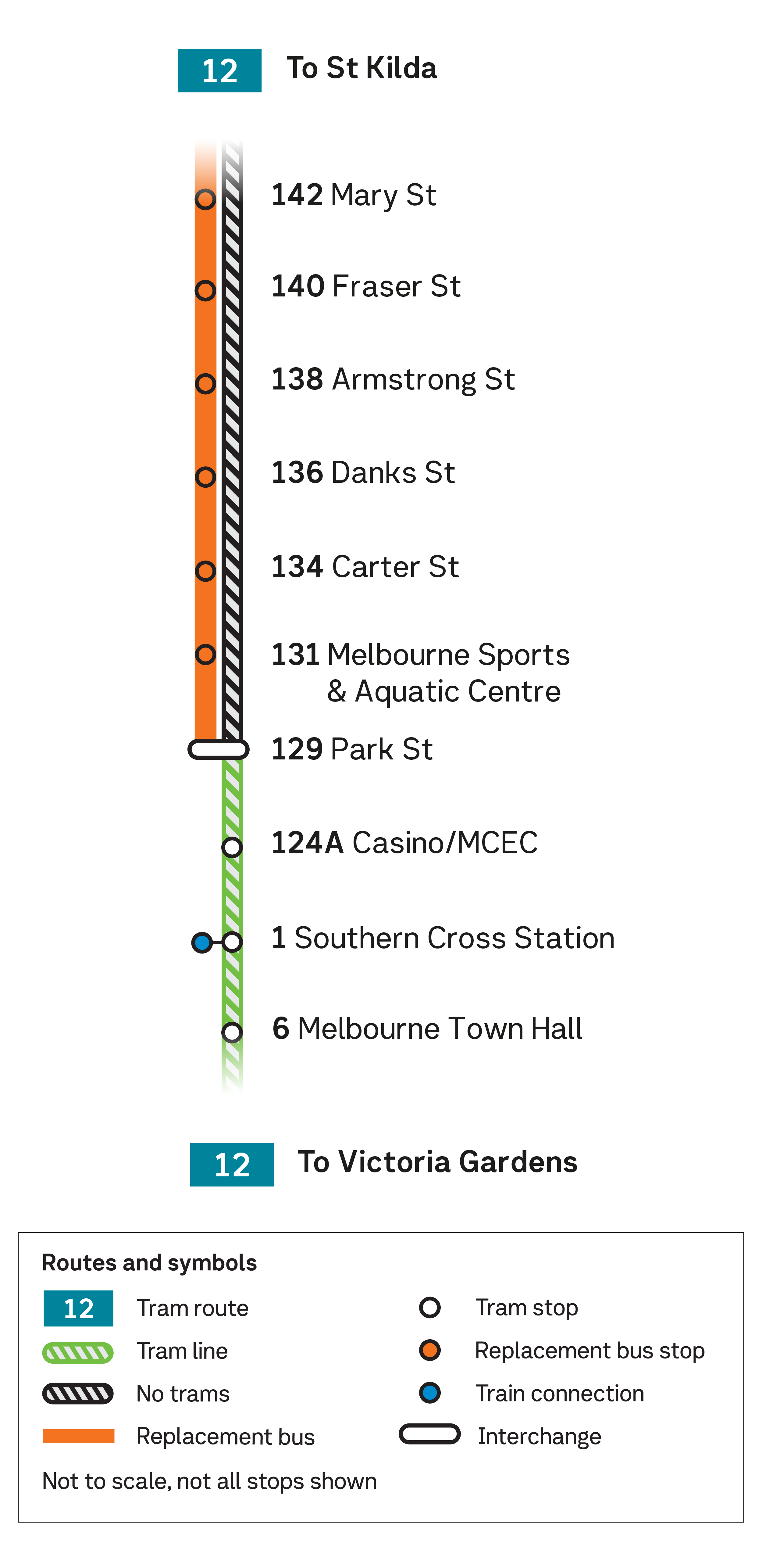 No Route 12 trams run between Stop 131 Melbourne Sports and Aquatic Centre and Stop 143 Fitzroy Street in St Kilda.