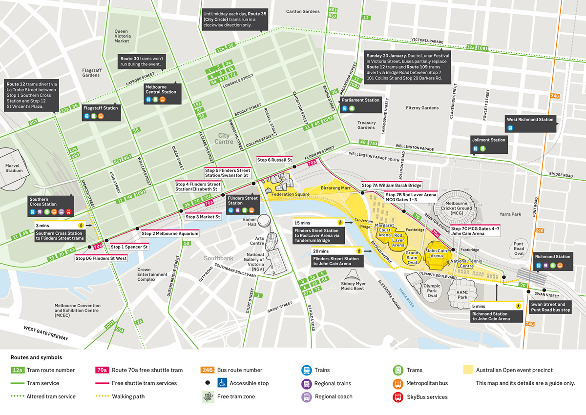 Free shuttle trams to Australian Open run as Route 70a between Stop D6 Flinders Street West and Stop 7C MCG Gates 4-7/ John Cain Arena, until one hour after the end of play each night.