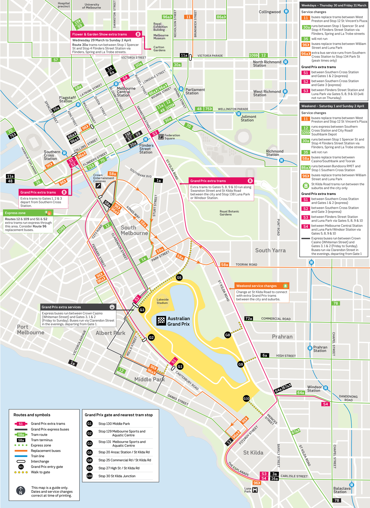 - Grand Prix extra trams run between Melbourne Central Station via Swanston Street and Flinders Street Station, Federation Square via St Kilda Road stopping at Gates 5, 8, 9 & 10