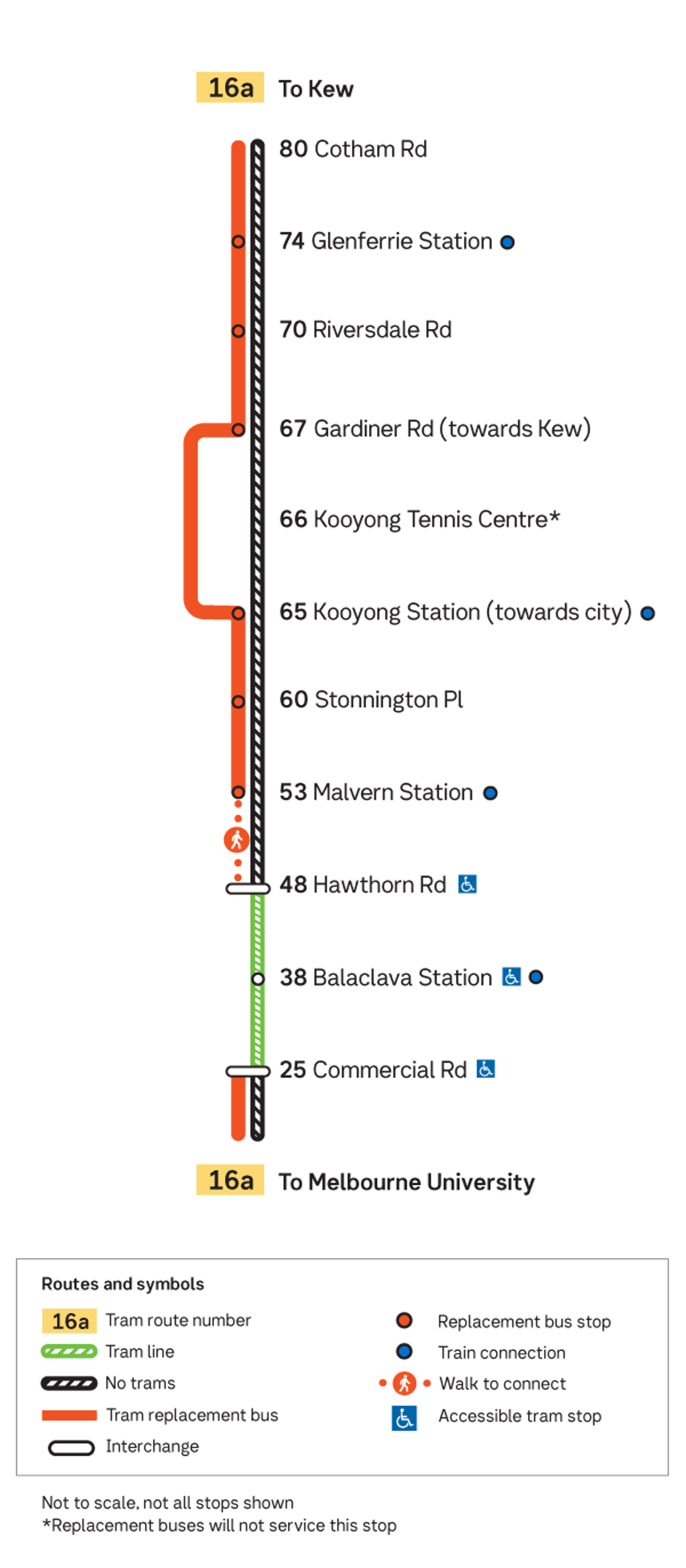 Buses replace Route 16 trams between Stop 53 Malvern Station and Kew. Buses divert around the Gardiner Bridge via Monaro Road, Toorak Road, Auburn Road, Woodburn Road and Glenferrie Road.