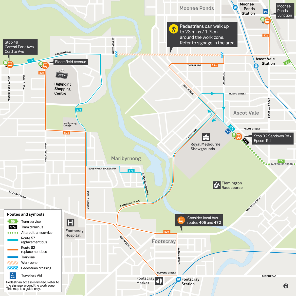 West Maribyrnong diverting around the work zone. - Route 57 trams run a shortened service between Stop 1 Flinders Street Station and Stop 32 Sandown Road.
