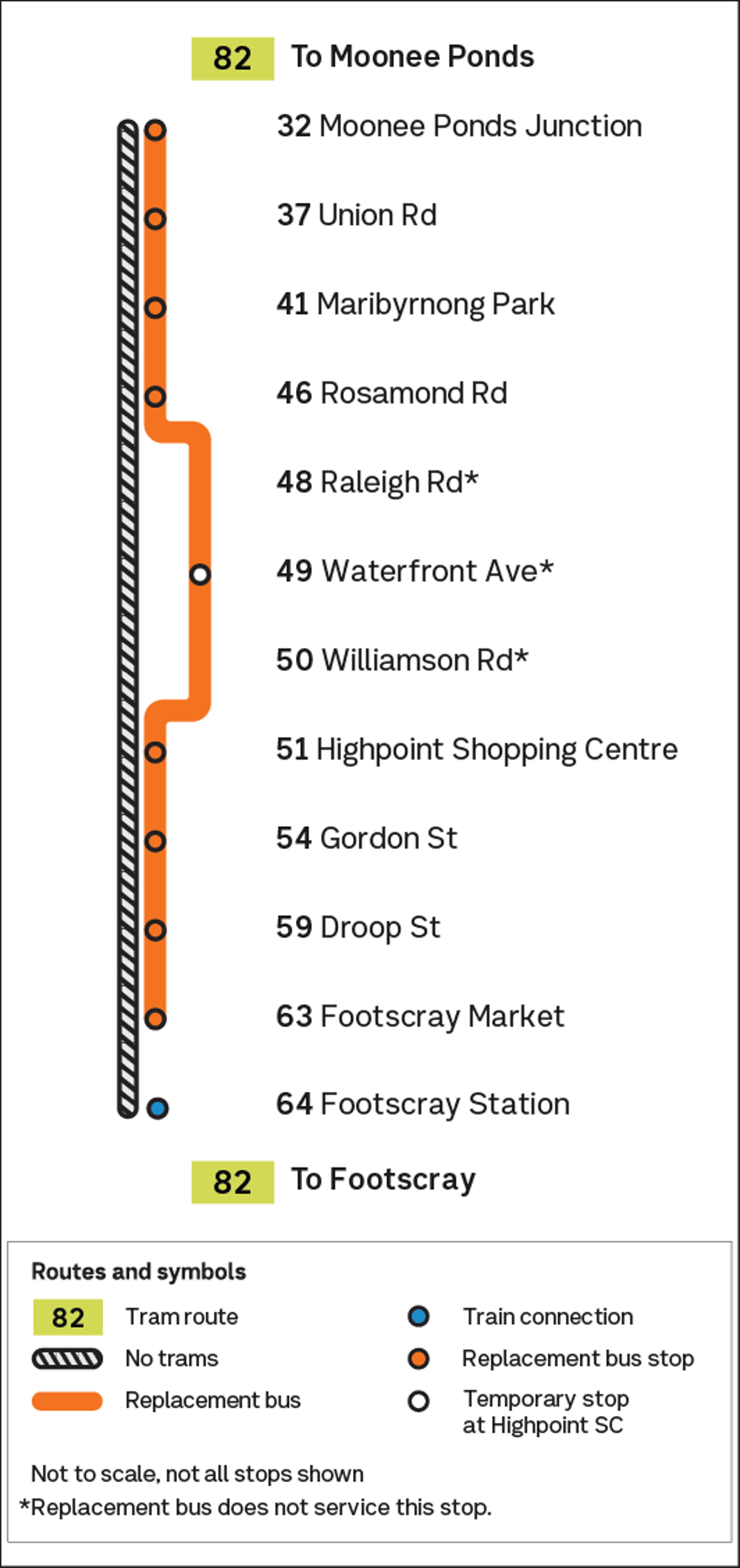 Buses replace Route 82 trams between Footscray and Moonee Ponds, diverting around the work zone via Rosamond Road.