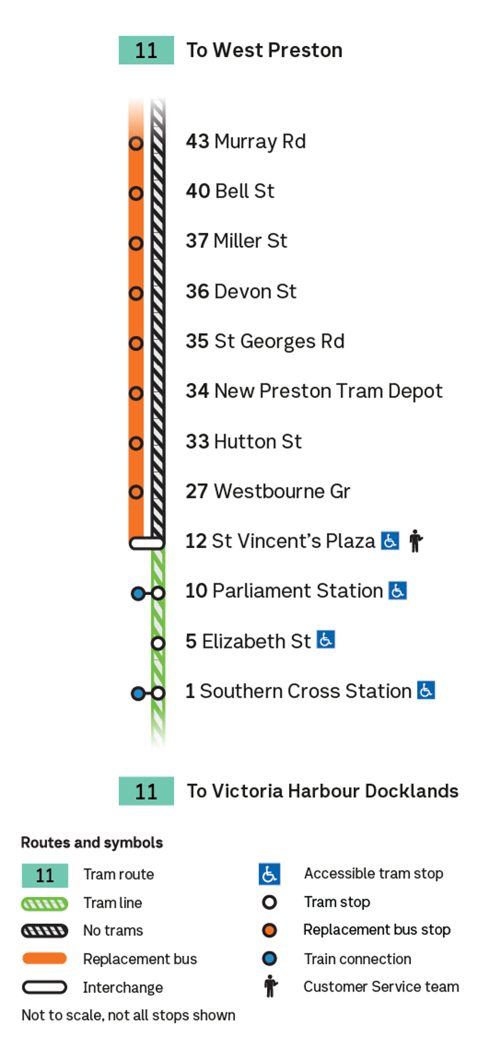 Route 11 trams run a shortened service between Stop 12 St Vincent's Plaza and Victoria Harbour Docklands.