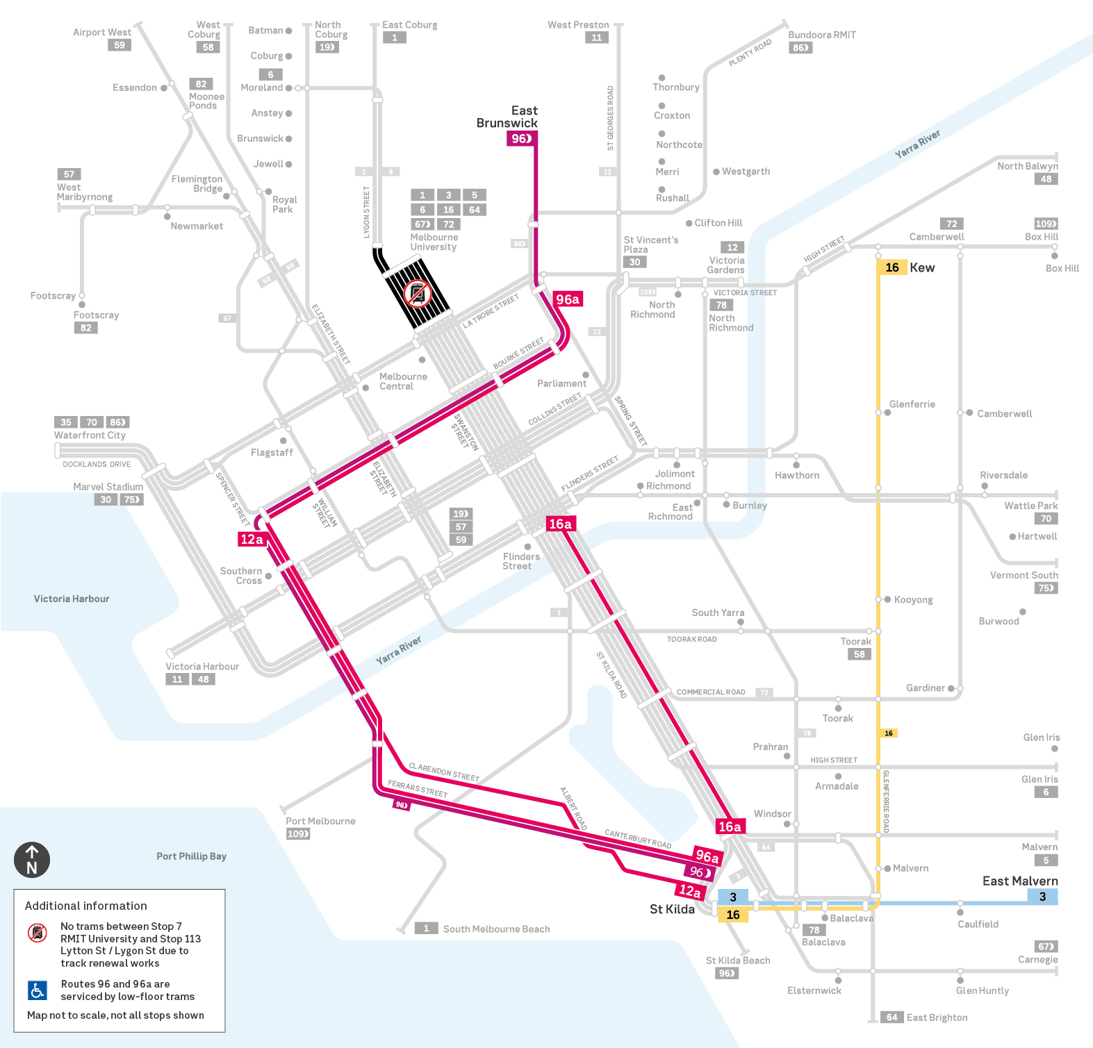 - Route 16a between Flinders Street Station and St Kilda Junction from 6.30am to last tram.