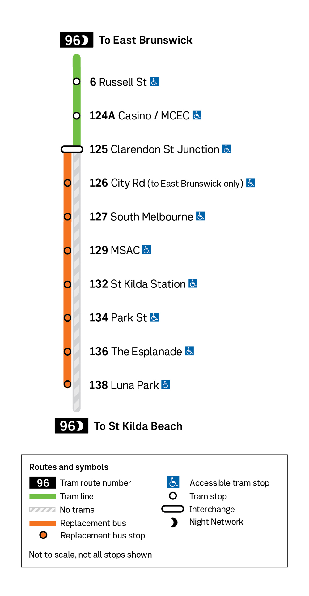 Buses replace Route 96 trams between Stop 125 Clarendon Street Junction and Stop 138 Luna Park.