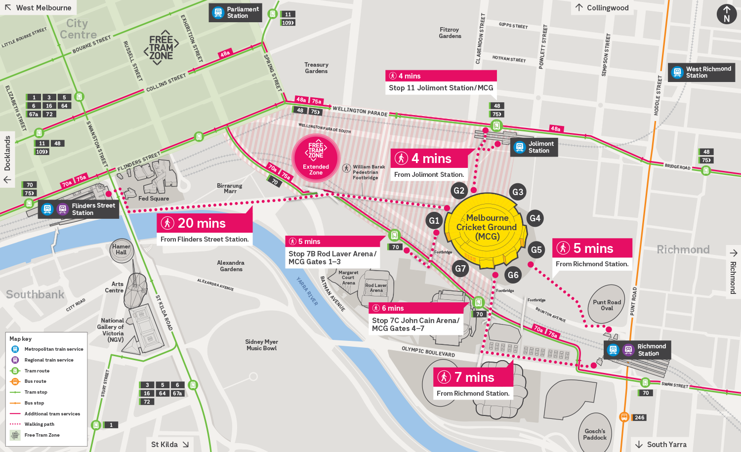From Friday 16 February to Sunday 18 February (inclusive) the Free Tram Zone will be extended to the Melbourne Cricket Ground (MCG).