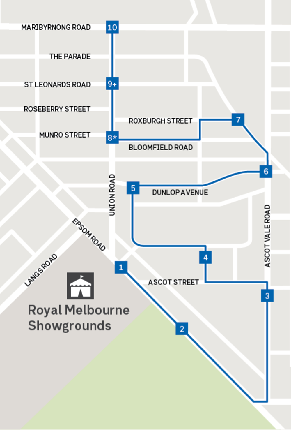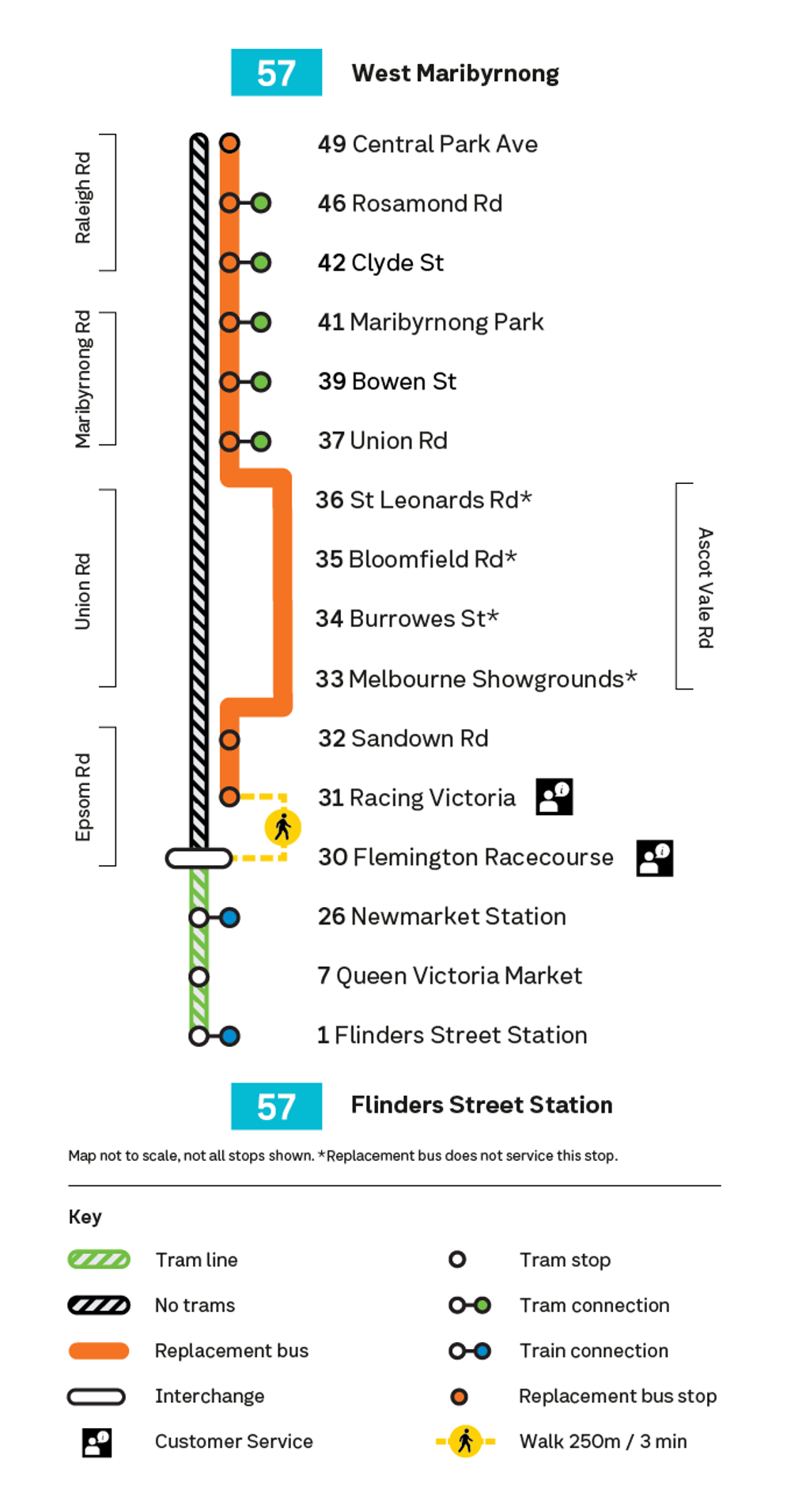 Buses replace trams on Route 57 between Stop 31 Racing Victoria and West Maribyrnong diverting around the work zone via Ascot Vale and Maribyrnong roads.